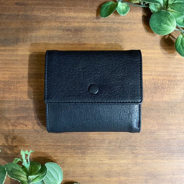 【牛革】ブラックボタン3つ折り財布〈BLACK〉 本革 レザーウォレット 折りたたみ財布 コンパクト W0011